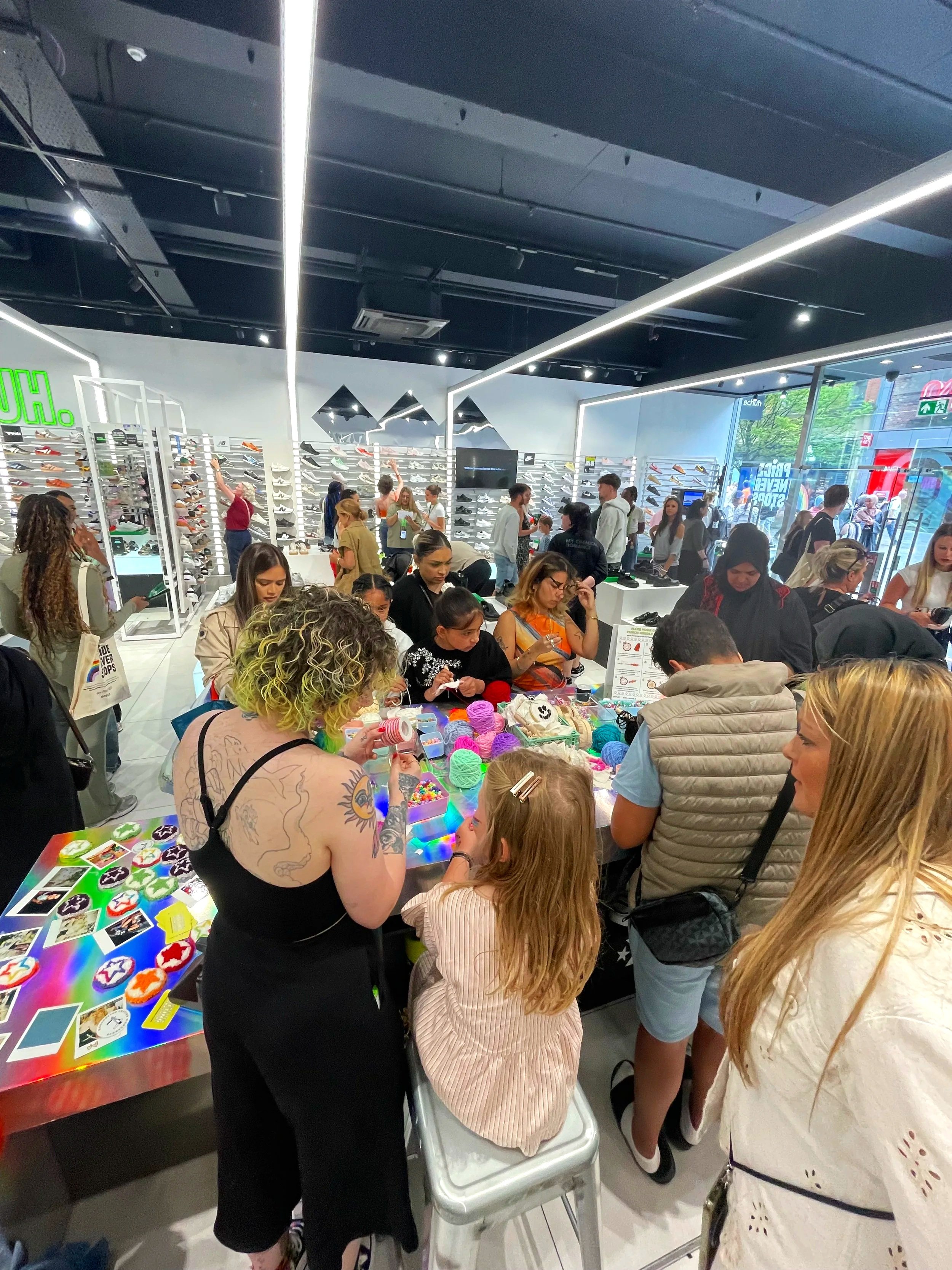 Commissioned by Converse and hosted by Schuh on Market Street during Manchester Pride’s August bank holiday, we delivered an open-access punch needle and charm-making workshop right in the heart of the city.